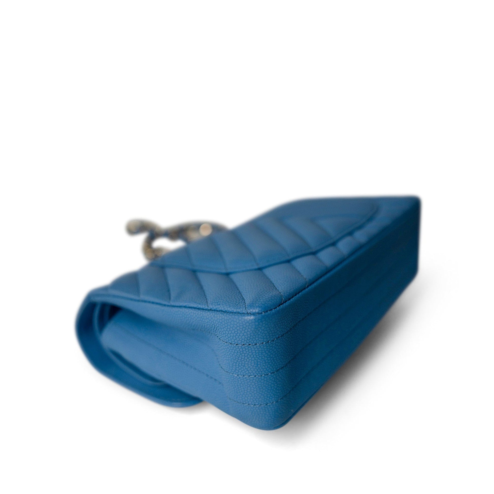 This Chanel Classic Flap bag showcases an incredible condition in soft blue caviar chevron. Light gold hardware provides luxurious accents to this glamorous design. Authentic and in small size, this exquisite piece is one of a kind.