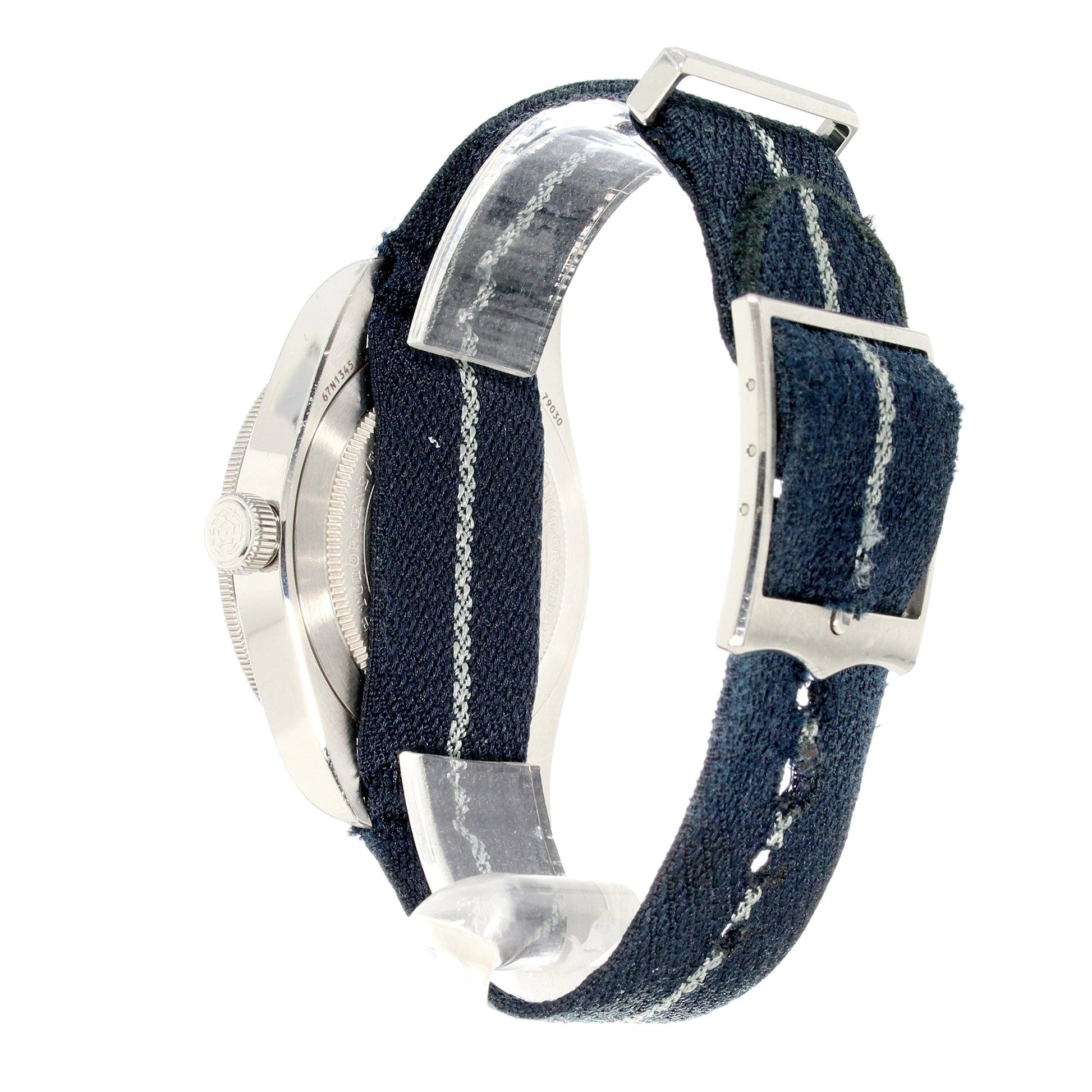 The blue fabric strap features a silver stripe down the center, and is eauipped with a steel buckle.