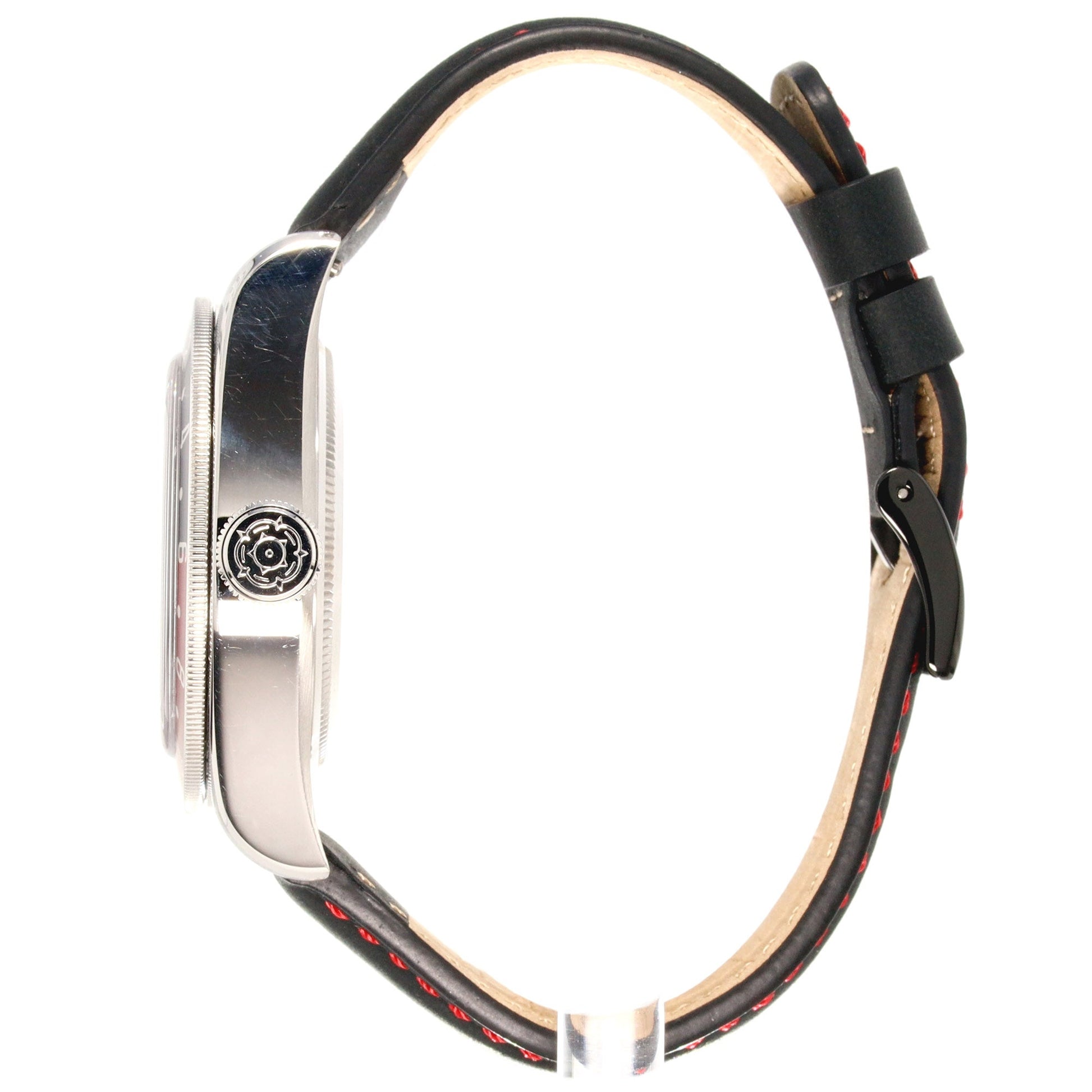 This watch comes on an aftermarket black suede band with red stitching and a black buckle, with the original Tudor fabric strap in the box.