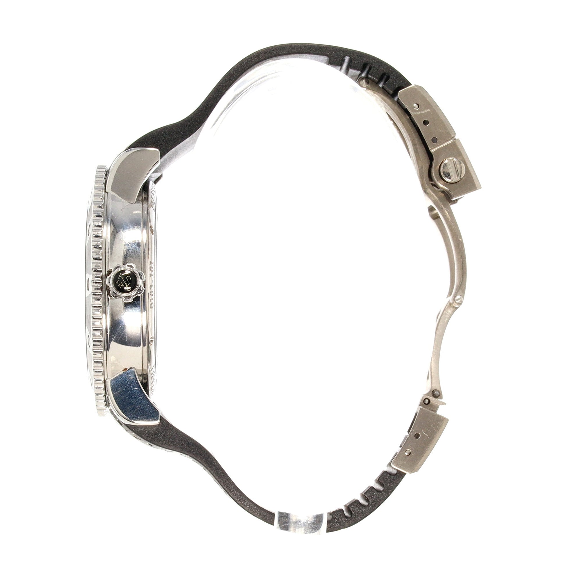 The black rubber strap is accented with 28 diamonds, equipped with a brushed Titanium clasp, and fits a 6 inch wrist.