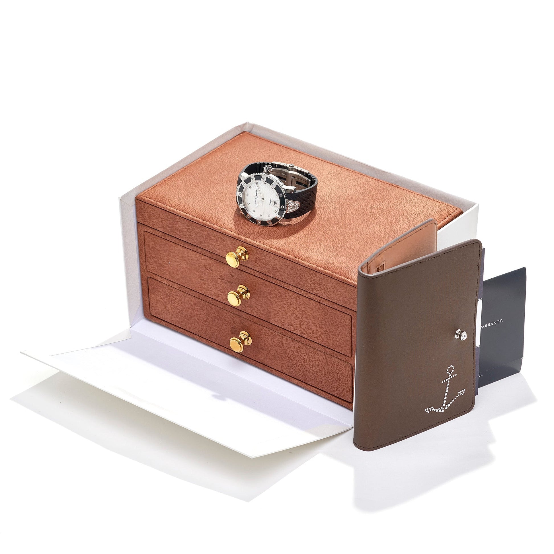 Ulysse Nardin Lady Diver Marine (ref. 8103-101, c. 2010) with a 40mm polished steel case, featuring a sapphire crystal and caseback, a fixed bezel with black ceramic and diamond inserts, and a screw-down crown with black bead accents.