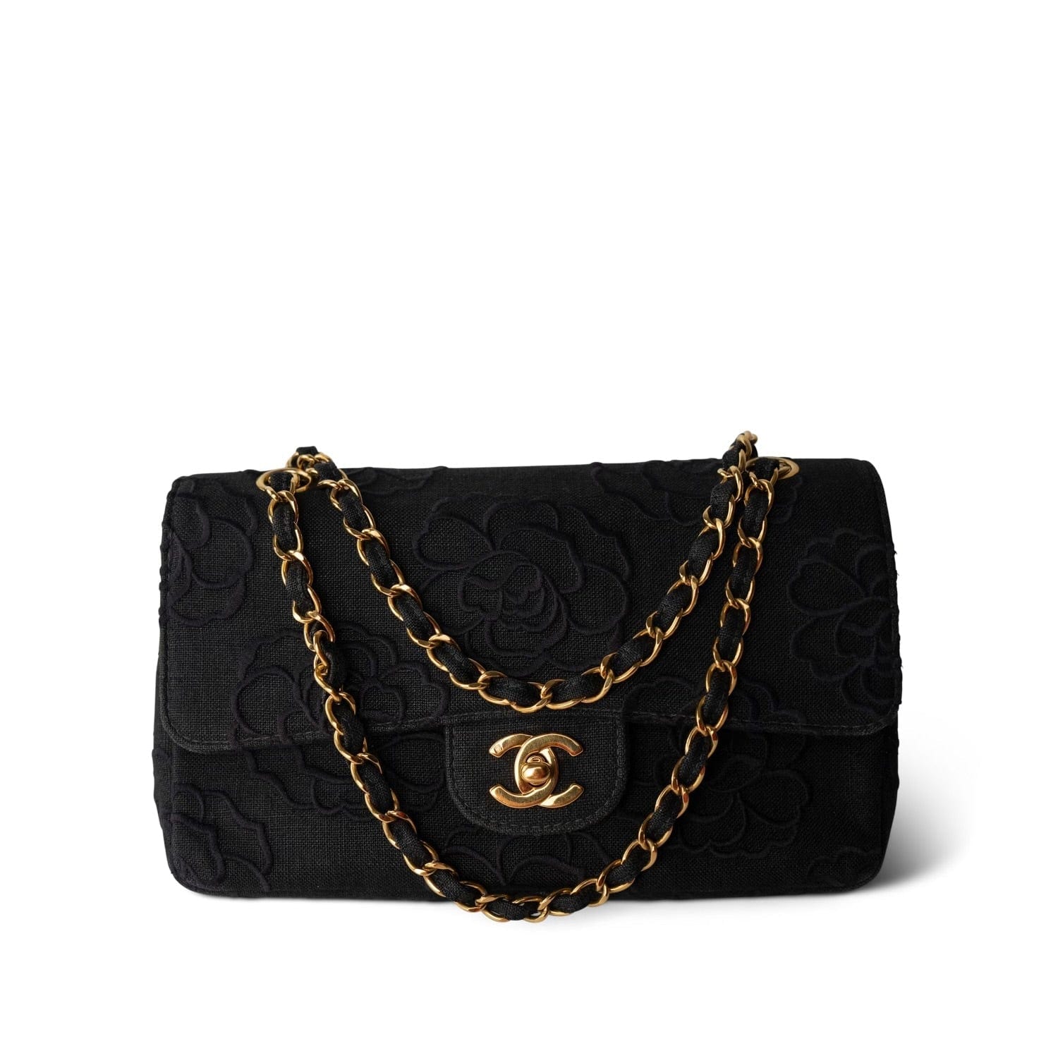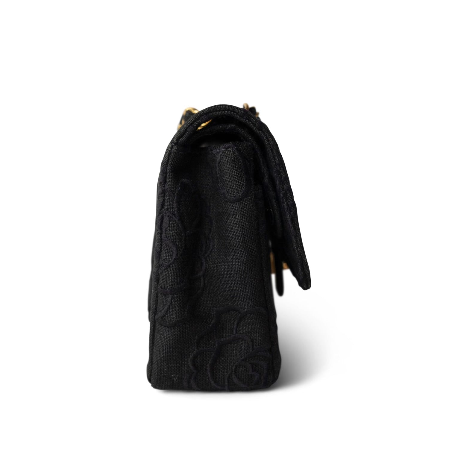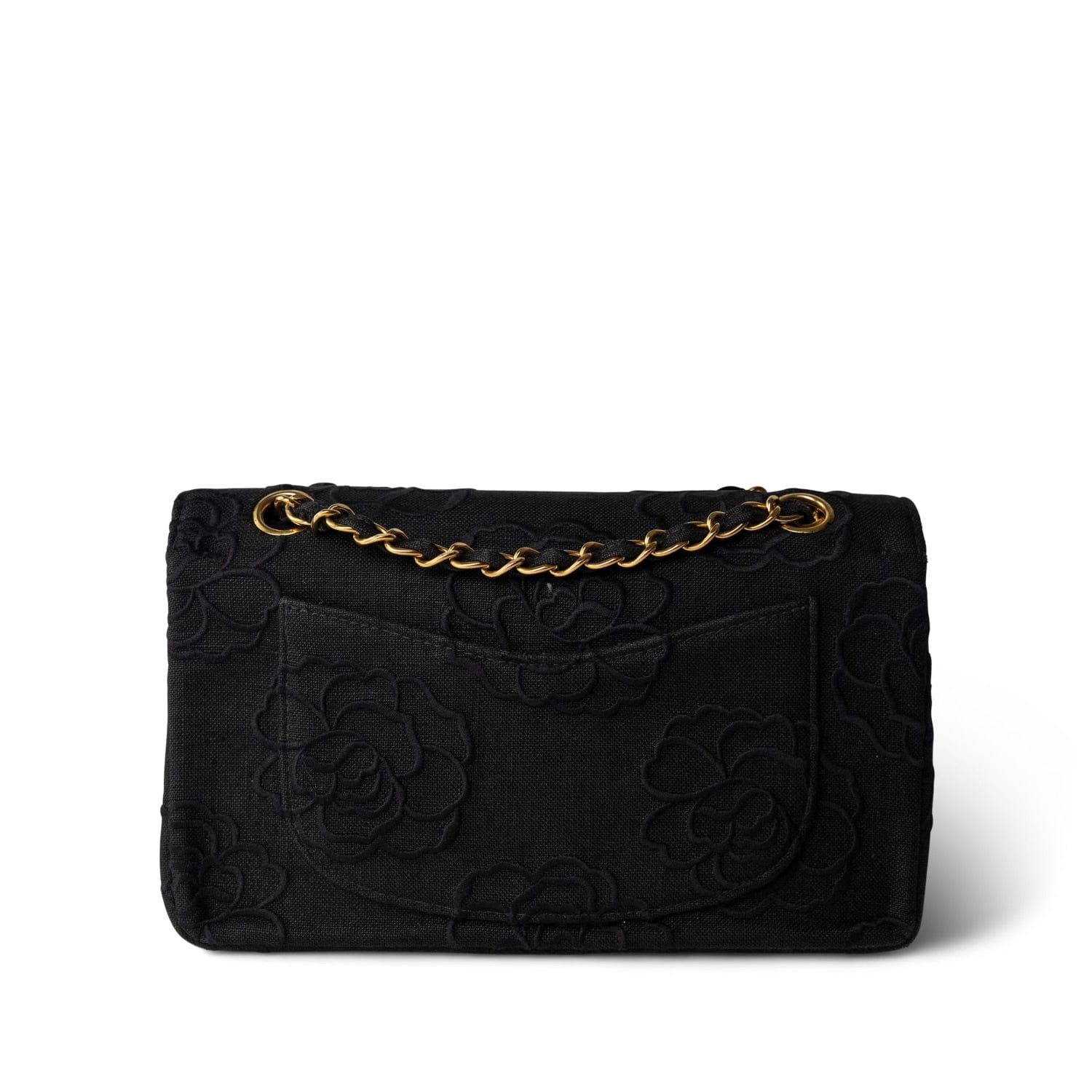(SOLD!!!) Vintage Black Canvas Camellia Classic Small Double Flap Gold Hardware