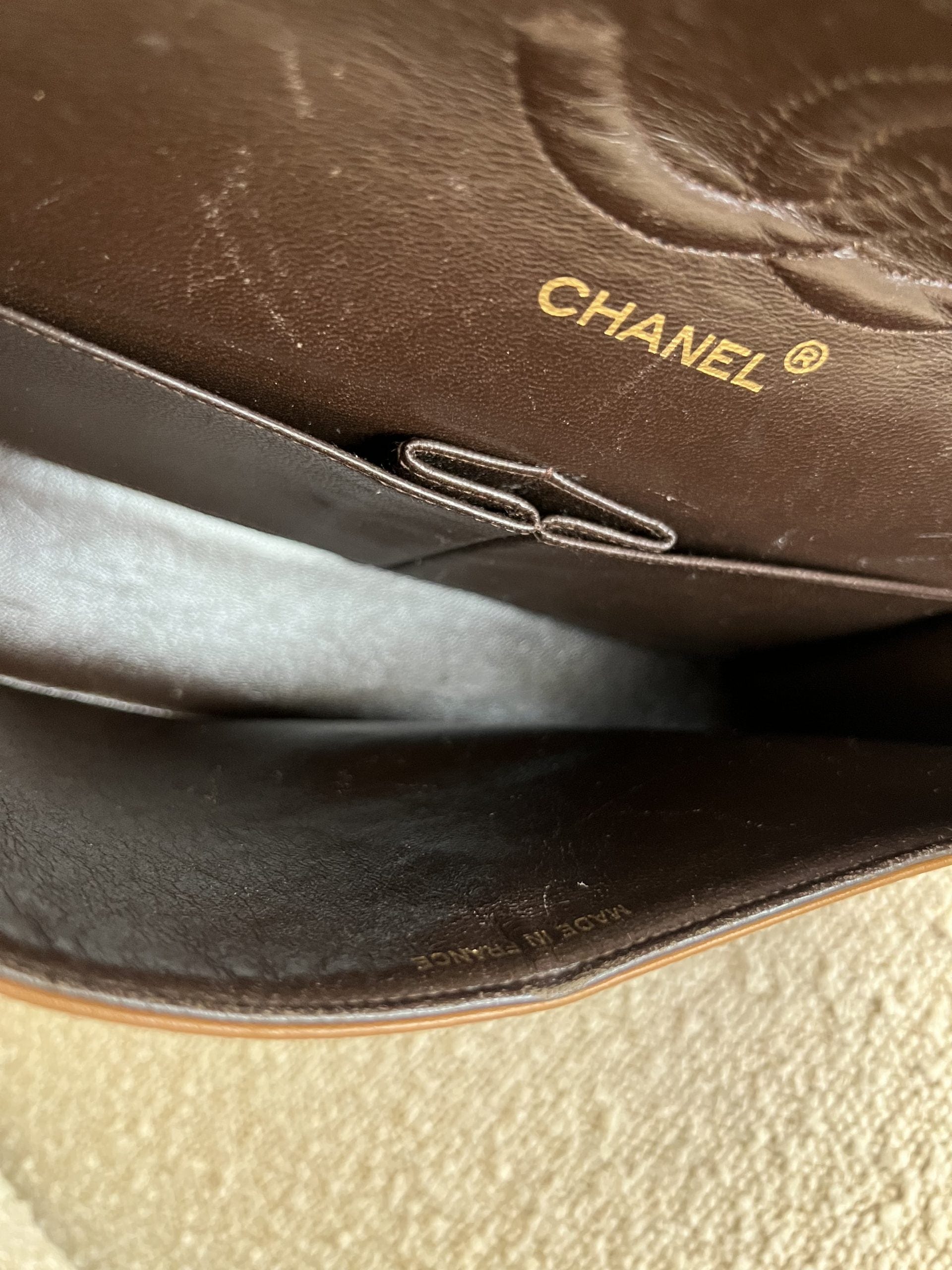 Condition Details: Mild scratches on the turn lock. Light indenting on the interior flap (from zipper/chain), few minor creases throughout. Patina on the corners and through the bag.