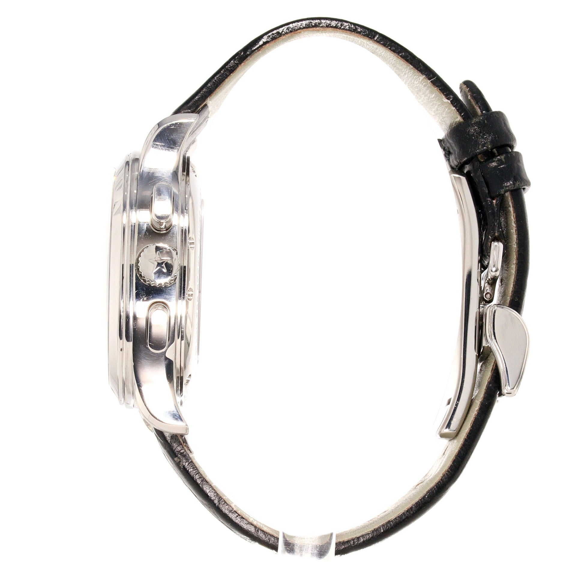 The black alligator strap is equipped with a polished stainless steel deployment clasp.